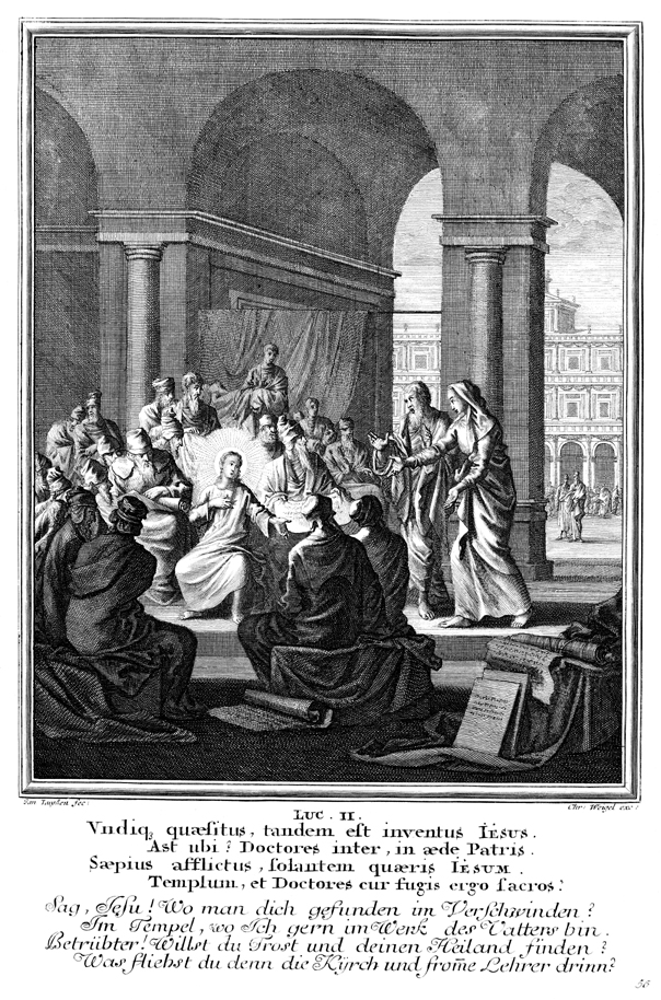 Description: Mary and Joseph find the twelve-year-old Jesus in the temple, sitting among the teachers, listening and asking questions.