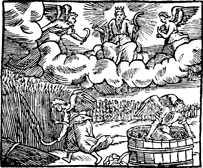 Description: The angels gather the harvest at the end of the age, as God looks on with pruning hook in hand .