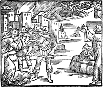 Description: Two angels drop a giant millstone, as Babylon (Rome) burns in the background.