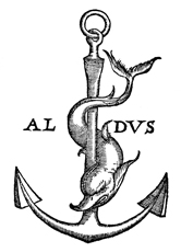 Description: The printer’s device of Paolo Manuzio (Latin, Paulus Manutius; 1512-1574) and the Aldine Press features an anchor (steadfastness, accuracy) and a dolphin (speed).