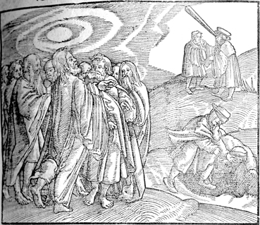 Description: Jesus speaks about judging others as a person with a plank in his eye corrects another with a speck in his eye and two blind people fall in a hole attempting to lead each other.