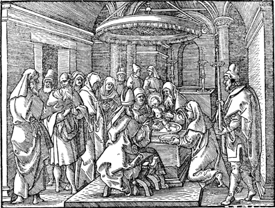 Description: The circumcision and naming of John the Baptist on the eighth day after his birth. Kirchen-Postilla das ist, Auslegung der Episteln und Euangelien, von Ostern bis auff das Aduent (1549 Luth H) uses the same image for the circumcision of Jesus.