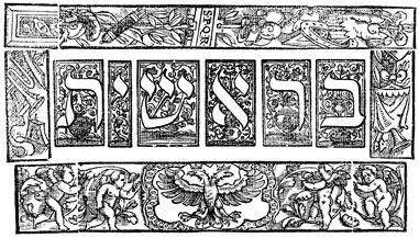 Description: This Hebrew word that begins a sentence in this volume is used in decorative design. Above the design are the initials S. P. Q. R. symbolic of the Roman Empire, while below it is the double-eagle symbolic of the Holy Roman Empire.