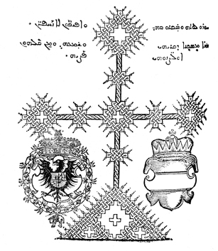 Description: A decorative cross with the coat of arms of Holy Roman Emperor Charles V to the left, and Austrian Archduke Ferdinand, who would succeed Charles as Holy Roman Emperor, to the right.
