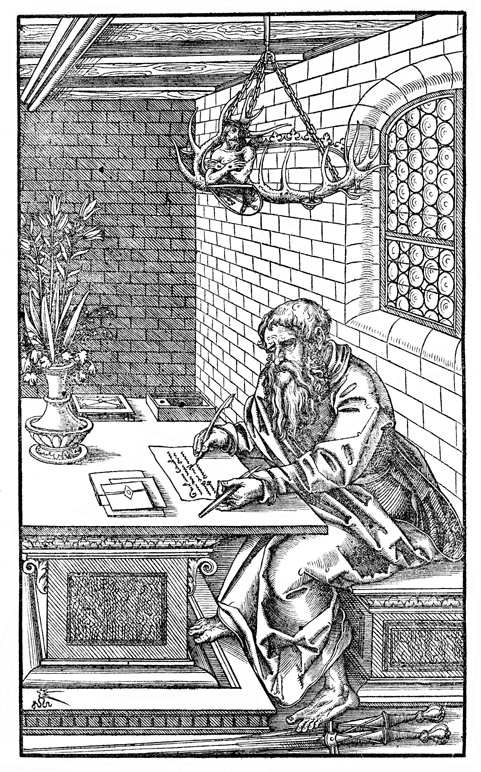 Description: The Apostle Paul writes one of his epistles, and overhead in the deer antlers is the suffering Christ with the symbols of his execution.