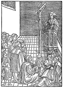 Description: A Lutheran minister preaches to his congregation in this image, which illustrates the first petition in the Lord’s Prayer, “Hallowed be thy name”.