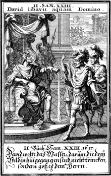 Description: David pours out the water that three of his soldiers drew from the well near the gate of Bethlehem.