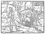 Description: A woman plays a musical instrument as a herdsman drives his herd through a forest.