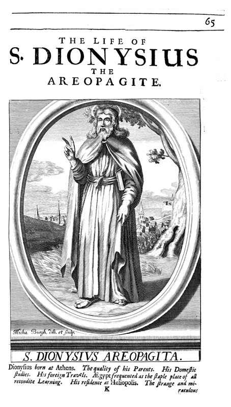 Description: Here Dionysius the Areopagite, a convert of the Apostle Paul, extends his right hand in the sign of blessing. This engraving is the work of Michael Burghers.