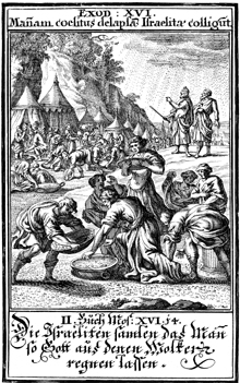 Description: The Israelites gather manna as it falls from heaven.