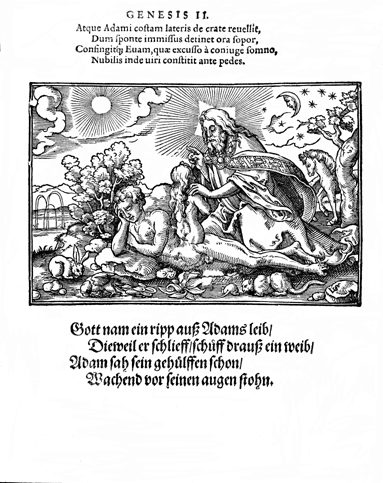 Description: As Adam sleeps, God creates Eve from his side. The artist, Virgil Solis (1514-1562), has placed his monogram in the lower right corner of the woodcut.