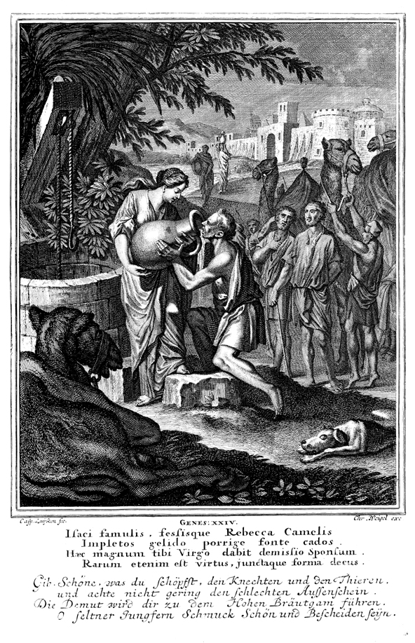 Description: Rebekah serves water to Abraham's chief servant and camels, showing that she is God's chosen wife for Isaac. The names of the engraver or artist, Caspar Luyken/Luiken (1672-1708), and the printer, Christoph Weigel (1654-1725), are located below the woodcut at the bottom left and right.