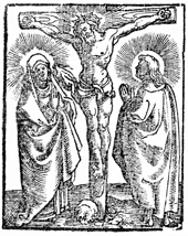 Description: Jesus hangs on the cross as Mary and the beloved disciple look on.