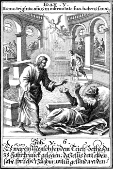 Description: Jesus heals the paralytic at the pool of Bethesda as an angel stirs the waters.