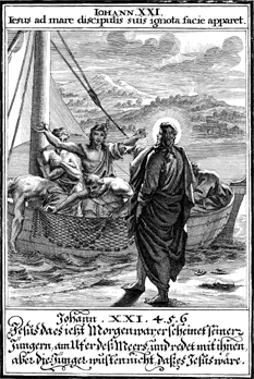 Description: Jesus appears to the disciples on the seashore and instructs them to put down their net on the right side of the boat.