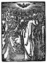 Description: At Pentecost the Holy Spirit descends on Jesus’ disciples, who are gathered around Mary.