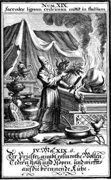 Description: Eleazar sprinkles the burning heifer with blood.
