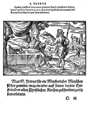 Description: The apostle Peter gives a letter to a messenger. A key, Peter’s attribute, is shown lying on the ground at his feet.
