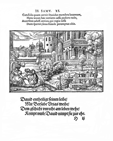 Description: As David looks down from a palace balcony, Bathsheba bathes in a pool, accompanied by her attendants. The artist, Virgil Solis (1514-1562), has placed his monogram in the lower left corner of the woodcut.