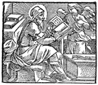 Description: St. Matthew writes his gospel with his attribute, the angel, nearby.