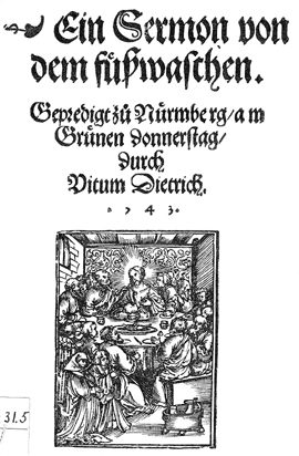 Book Title: Ein Sermon von dem fusswaschen. : Gepredigt zuo Nürmberg, am Grünen donnerstag, / Durch Vitum Dietrich. 1543