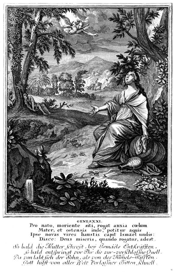Description: After hearing their cries of thirst and despair in the desert of Beersheba, God sends an angel to comfort Hagar and Ishmael, and to point out a nearby well for them to fill their empty flask.