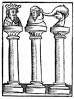 Description: Three pillars are topped, one by a king, the second by a monk, and the third by a hand holding a horn.