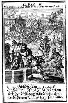 Description: Israel destroys Moab by pouring rocks on their land and laying siege to the city. When the king of Moab noticed that the war had gone against him, he offered his son as a sacrifice in the fire (rear).