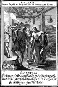 Description: Jesus converses with Cleopas and another disciple on the road to Emmaus. Upon coming to Emmaus, the disciples insist that he stay with them for the night.