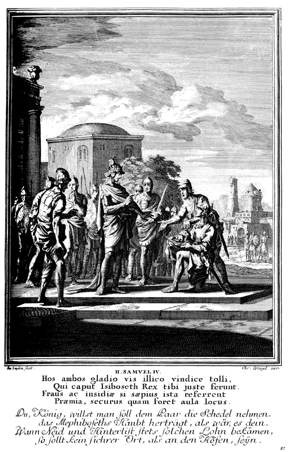 Description: The head of Ish-Bosheth is brought before David. David orders Rechab and Baanah killed for murdering this son of Saul.
