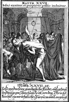 Description: The Roman soldiers mock and beat Jesus.