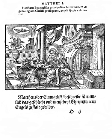 Description: The Apostle Matthew writes his gospel with an angel and the Holy Spirit (in the form of a dove) nearby for inspiration. The initials “S.F.” have been added to the chair on which Matthew sits.