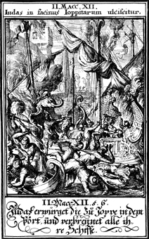 Description: Judas Maccabeus attacks and sets fire to the harbor of the murderers of his brothers.