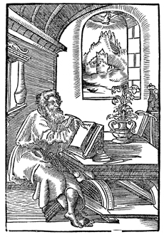 Description: Given its placement in this New Testament, the Apostle Paul is shown writing a letter to Timothy.