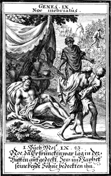 Description: Ham dishonors Noah by pointing out his nakedness, but Shem and Japheth cover their father with a sheet.