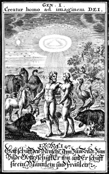 Description: Adam embraces Eve, while surrounded by God’s glory (represented by a radiating light enclosed around the Trinitarian symbol of a triangle) and the previous days’ creation.