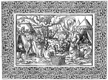 Description: Pharaoh and Egypt’s premiere magicians and wise men listen with great wonder, as Joseph interprets Pharaoh’s dreams of the seven fat and seven lean cows, and the seven good and seven lean stalks (background). The artist, Virgil Solis (1514-1562), has placed his monogram at the bottom (center) of the woodcut.
