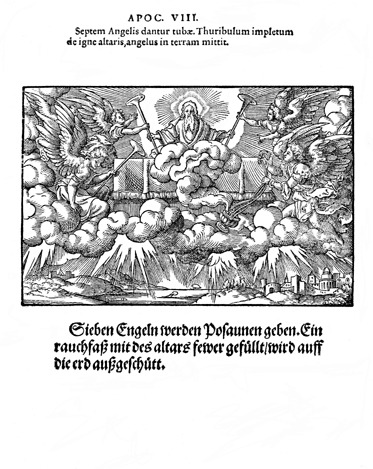 Description: Upon the opening of the seventh seal, angels are given seven trumpets, while another pours out a golden censor upon the earth.