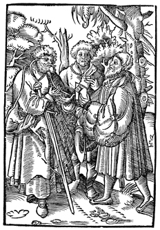 Description: Illustrating Paul's correspondence with the Corinthian church, here the Apostle Paul receives (or sends?) a letter from a richly dressed emissary of the church. The apostle has his typical attribute, the sword, and the church's messenger, hat in hand, passes along to Paul a sealed envelope.