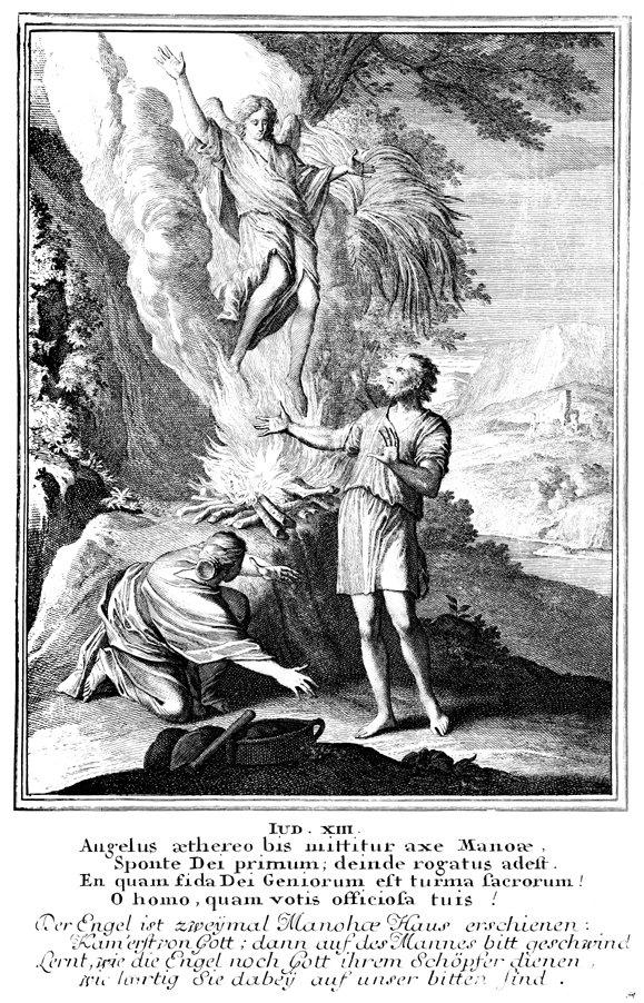 Description: An angel appears to Manoah and his wife from the fire of their sacrifice and proclaims the birth of Samson.