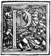 Description: An initial letter P with a man fighting a skeleton.