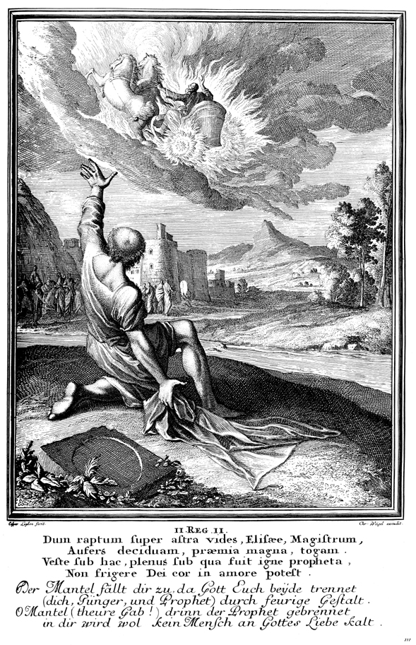 Description: Elisha receives Elijah's mantle upon seeing him taken to heaven in a chariot of fire. Elisha parts the water with the mantle he received from Elijah.