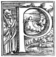 Description: Initial letter "P" featuring the Apostle Peter with his attribute, a key.
