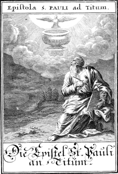 Description: Paul writes his epistle to Titus, as an image of a baptismal font and a dove appear, representing the water of rebirth and the renewal of the Holy Spirit.