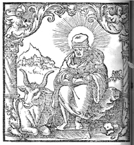 Description: Luke writes his gospel with his attribute, the bull, nearby.