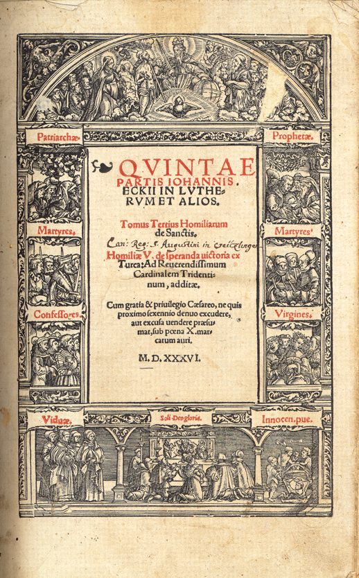 Description: Title-page within a historiated border including depictions of virgins, martyrs, prophets, innocents, confessors, and patriarchs beneath a depiction of the table in heaven.