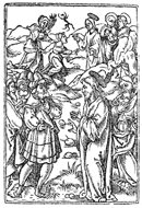 Description: Jesus casts out a demon (top) and converses with the Pharisees (bottom).