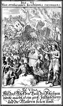 Description: The walls of Jericho begin to fall as the Israelites march around the city with the Ark of the Covenant and blow their trumpets.