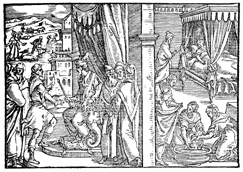 Description: After Joseph interprets Pharaoh’s dreams, he is promoted to vice-regent and manages the preparations for the seven years of famine during the seven years of plenty (background). On the right, Joseph’s visits with his wife (Asenath), as her maidservants tend to the newly born Manasseh and Ephraim.