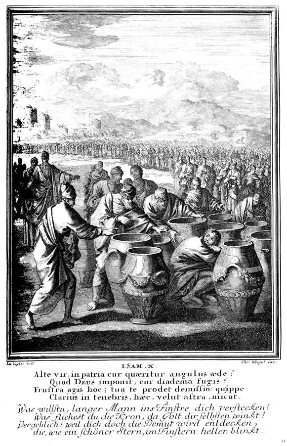 Description: When Saul is acclaimed king of Israel at Mizpah, he is found hiding among the baggage.